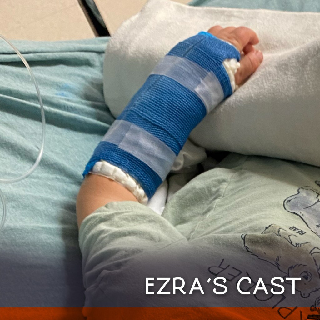 We find out that Ezra broke both forearm bones when he fell. It’s a common break and it shouldn’t be complicated for them to treat, but they’ll have to put him under to set his arm before they can put on the cast. I hold his hand as they give him the anesthesia.